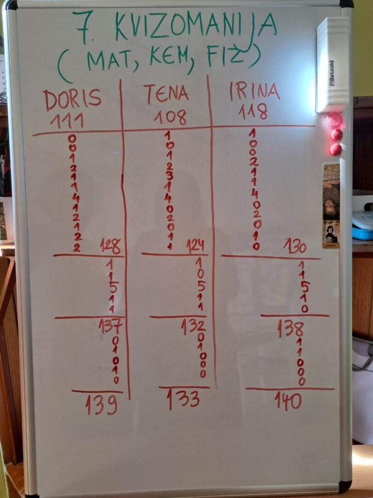Matematika, fizika i kemija bile su teme kvizomanije koja se održala 10. travnja. Zanimljiva znanastvena pitanja sastavili su učitelji Daria Novinc Podnar, Igor Lisac i Andrea Bolf Imširović. Tri školska tima znalački su rješavali pitanja, mozgali, razmišljali, i pokazali izvrsno znanje, a u vodstvu je tim Irina u sastavu Irina, Frida, Niko, Leo i Ivor. S nestrpljenjem očekujem završnicu kvizomanije.