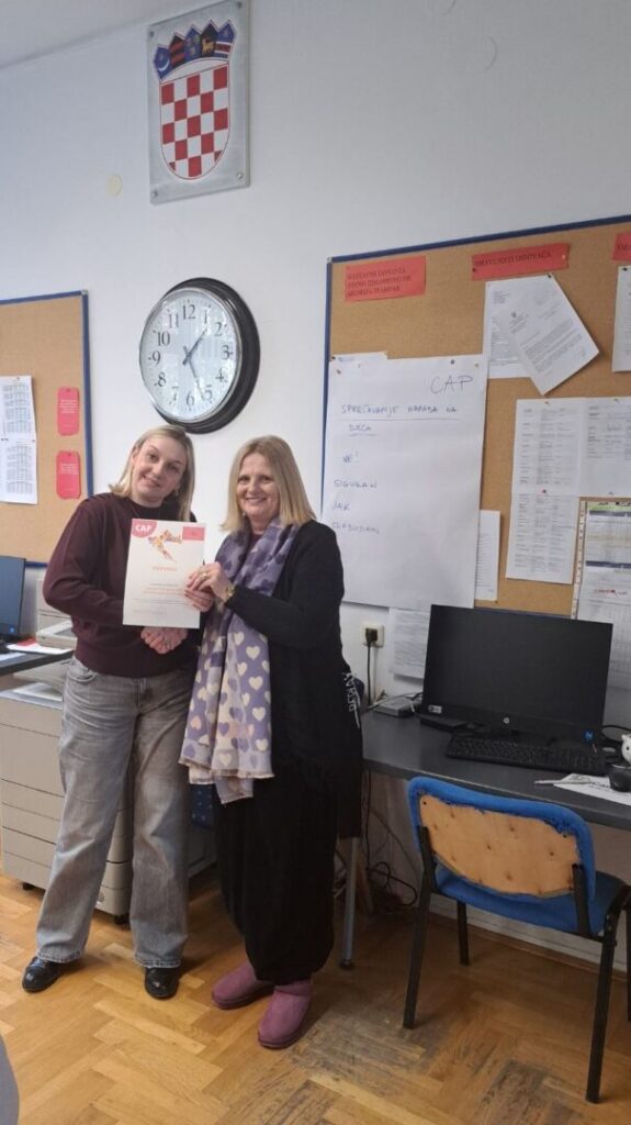 CAP (Child Assault Prevention) je program prevencije zlostavljanja djece i mladih koji ih poučava prevencijskim vještinama u slučajevima zlostavljanja. Na CAP seminarima educiraju se budući CAP pomagači koji će provoditi CAP u odgojno obrazovnim institucijama obrazujući tako druge odgojne obrazovne djelatnike, roditelje i djecu. Svake godine udruga roditelja Korak po korak organizira edukacije za nove CAP pomagače i pomagačice kako bi se mreža proširila. To je jedan od najstarijih i najuglednijih programa primarne prevencije zlostavljanja djece u svijetu, osnovan u SAD-u 1985., a u Hrvatskoj se provodi punih 20 godina. 27. i 28. ožujka učiteljice Vedrana Frlan, Danijela Antolić i Andreja Marković na seminaru koji je održan u zagrebačkoj OŠ Ivana Cankara u ugodnoj i poticajnoj atmosferi, uz stručno vodstvo edukatora i aktivno sudjelovanje i razmjenu iskustava postale su CUP pomagači u provedbi programa. Projekt financira Ministarstvo znanosti, obrazovanja i mladih Republike Hrvatske u okviru Natječaja za dodjelu bespovratnih sredstava za provedbu projekata usmjerenih mladima, prioritetno područje: P.4. Prevencija nasilja nad i među mladima.