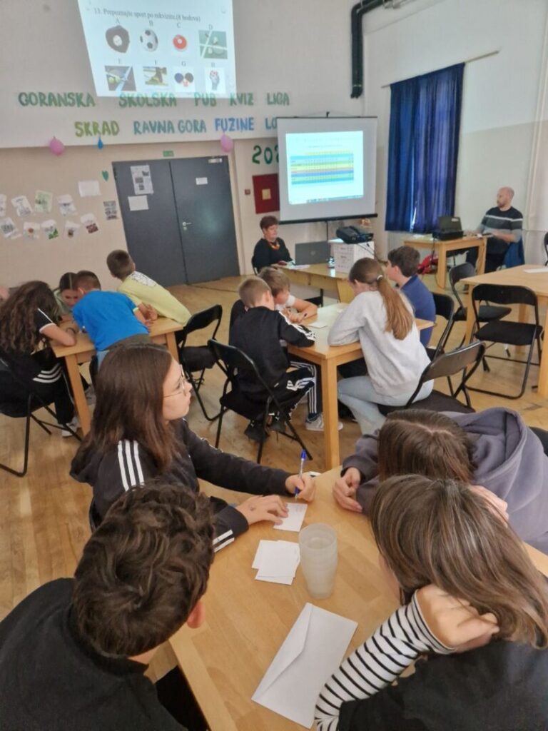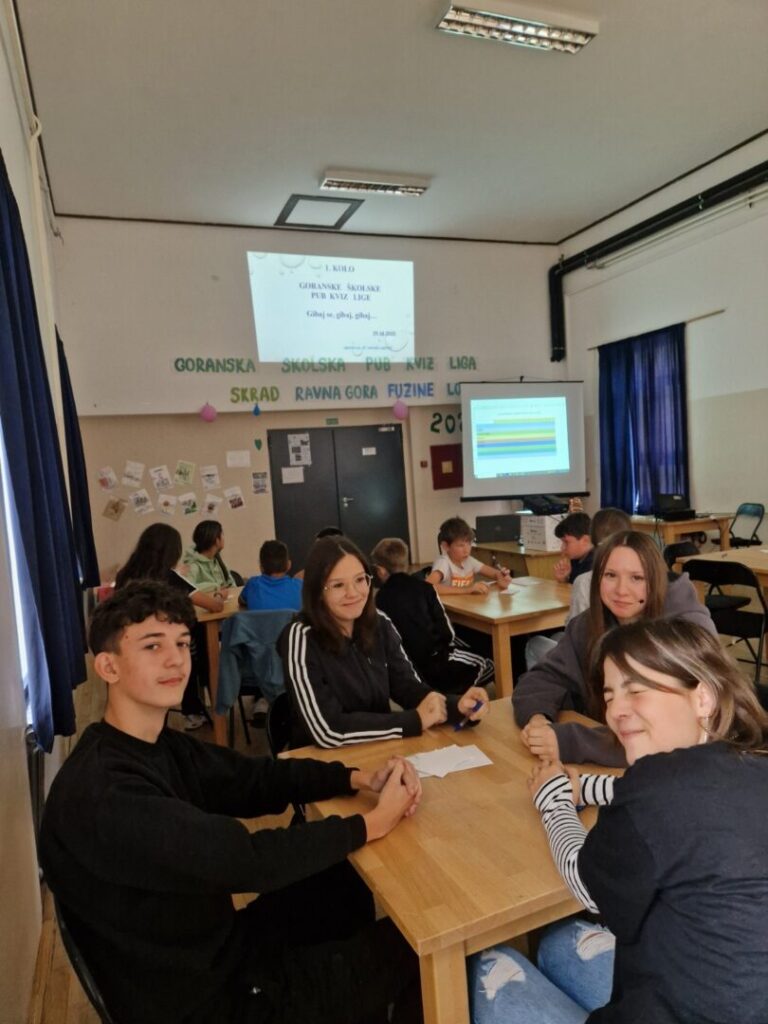 Ove školske godine uključili smo naše učenike u novu sezonu Goranske školske pub kviz lige. 29. listopada 2025. održano je prvo ovogodišnje kolo u Ravnoj Gori, tema je bila SPORT, a pitanja je pripremila ravnogorska učiteljica Nataša Lakotić. Kvizaška ekipa u sastavu Andrija Bolf, Tena Tonković, Frida Klobučar i Irina Čop natjecali su se s ekipama osnovaca iz Skrada, Fužina i Ravne Gore. Kao najbolji poznavatelji pitanja o raznim područjima sporta pokazali su se učenici ekipe Dobar dan iz Skrada. Čestitamo!!!