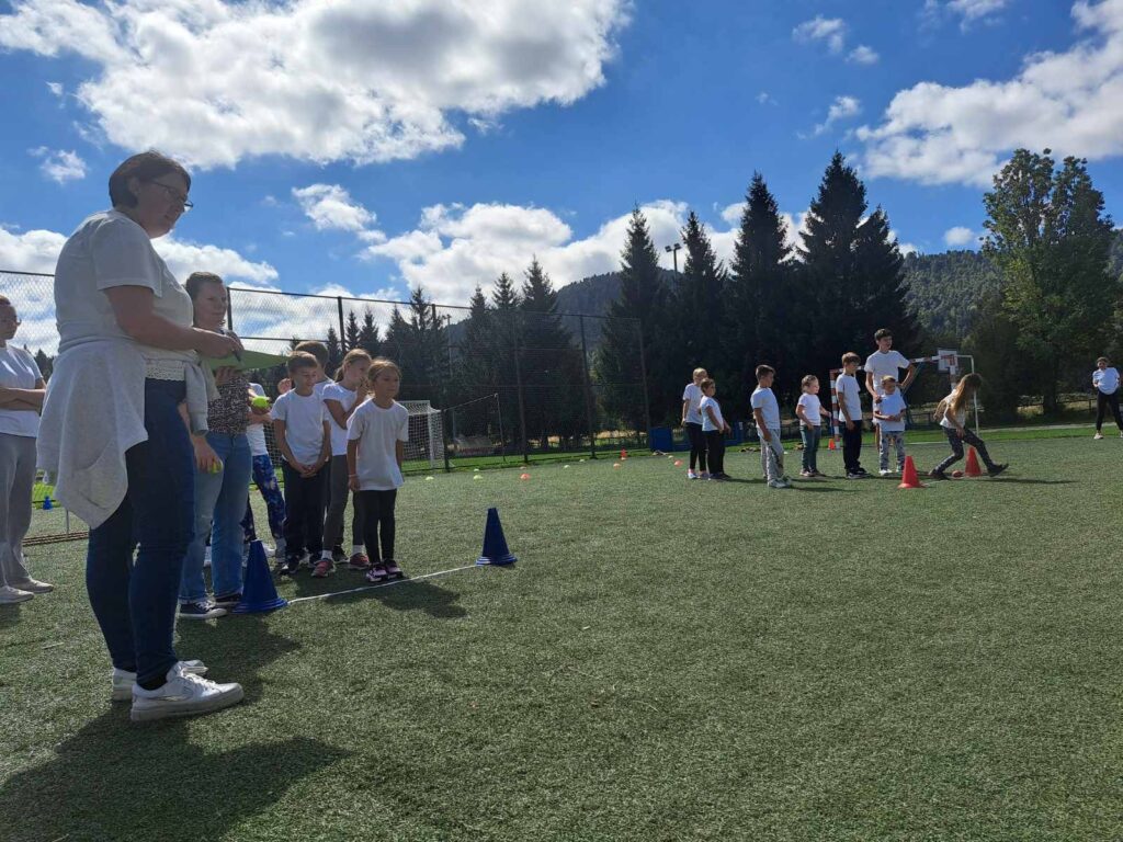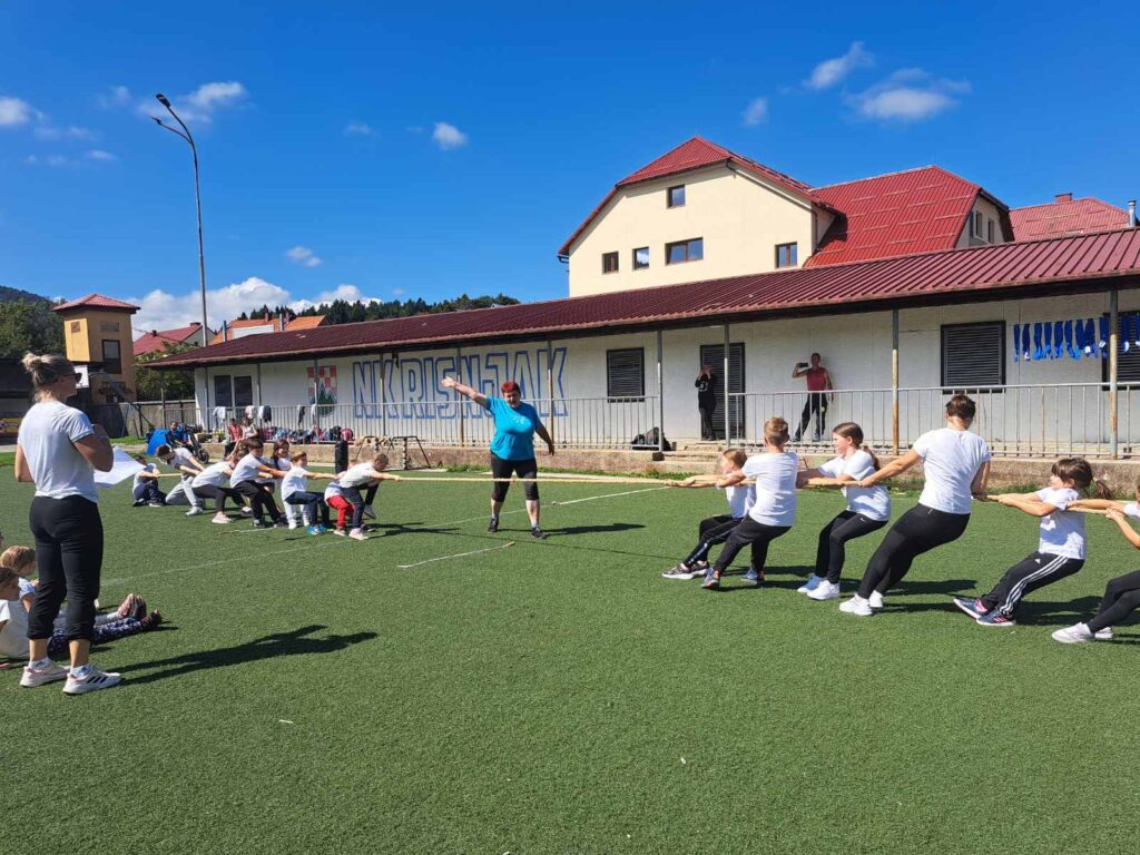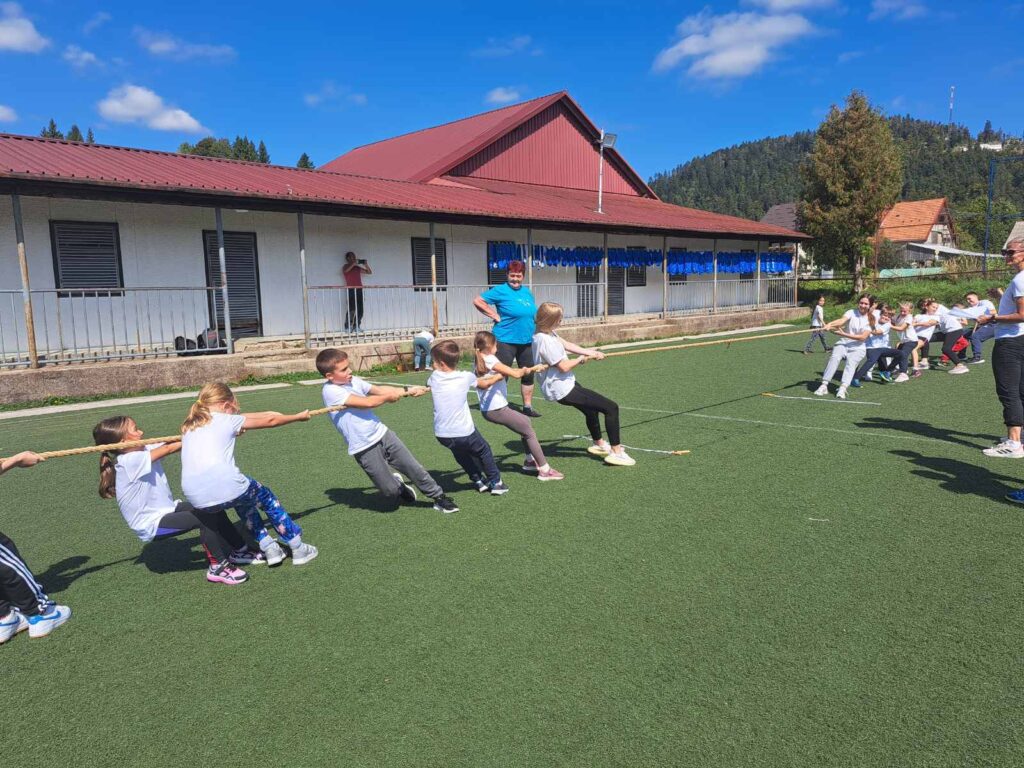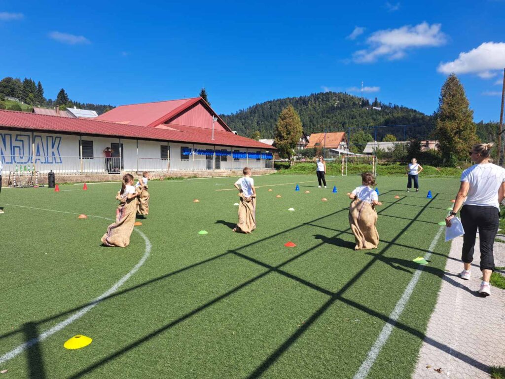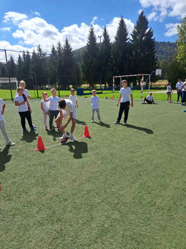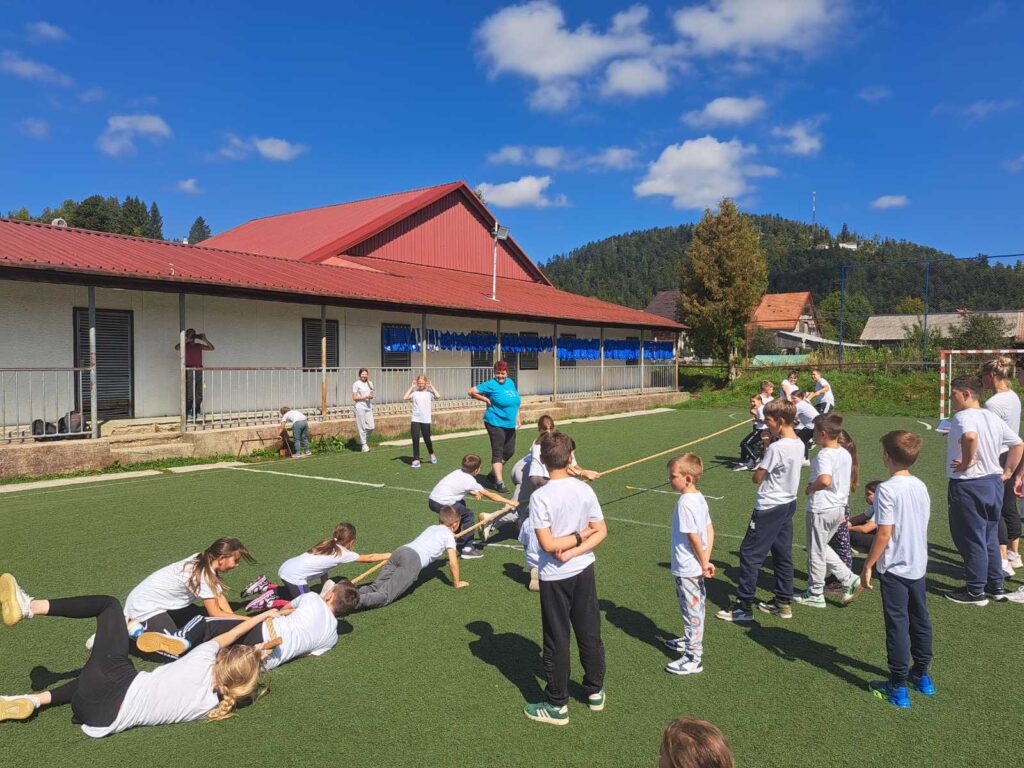 Nakon zajedničkog zagrijavanja svih učenika i učitelja, podijeljeni u 4 natjecateljska tima, skakali su u vrećama, potezali konop, trčali s jajima u žlici, bacali kamen s ramena, skakali u dalj, gađali lopticama koš na tlu, pokušavali lopticom srušiti plastične boce napunjene vodom…