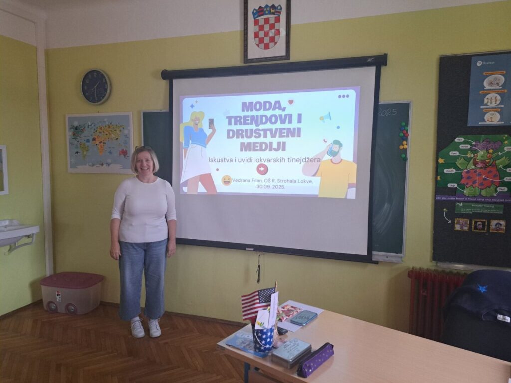 Vedrana Frlan, učiteljica engleskoga jezika, održala je 30. rujna na Učiteljskom vijeću predavanje pod nazivom “Moda, trendovi i društveni mediji – iskustva lokvarskih tinejdžera”. Podijelila je s kolegama svoj dobar primjer iz prakse koji potiče i promovira kritičko mišljenje te problemsko i istraživačko učenje naših učenika viših razreda kroz prizmu njihovih navika vezanih uz temu uporabe interneta i društvenih mreža te predstavila rezultate višegodišnjeg istraživanja tih navika iz vlastite i učeničke perspektive. Navedeni rezultati proizašli su iz debata, anketnog upitnika koji izrađuju i dijele učenici vršnjacima i razrednog eksperimenta pod nazivom “24 sata bez interneta, društvenih medija i video-igara” u 7. razredu te učeničkog osvješćivanja vlastitih obrazaca ponašanja kada je posrijedi uporaba interneta. Predavanje je bilo vrlo zanimljivo, kreativno i poticajno za sve učitelje.